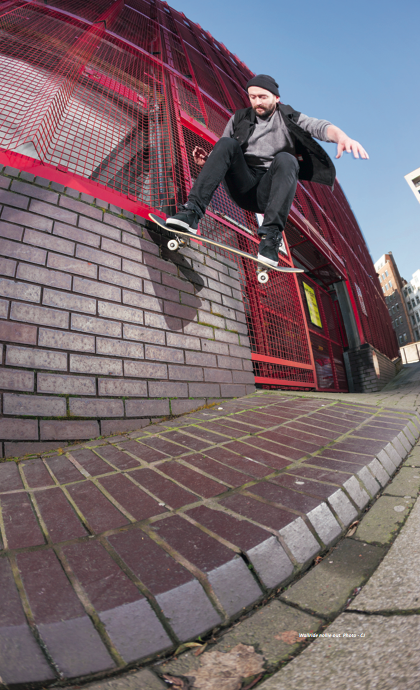 – Seems like a lifetime ago to be honest! That spot was at the University in Birmingham. It was on the day of one of the jams Ideal used to hold at the Custard Factory when they had that big ramp. Wig shot it. I’d skated it few times as the run up was real good but the landing was shitty, but it was easy to just train up on I guess. I wanted to nosegrind it, Wig was around that day so I went and shot it. Don’t really remember it being that much of mission. We went back to the Custard Factory and skated the rest of the day!