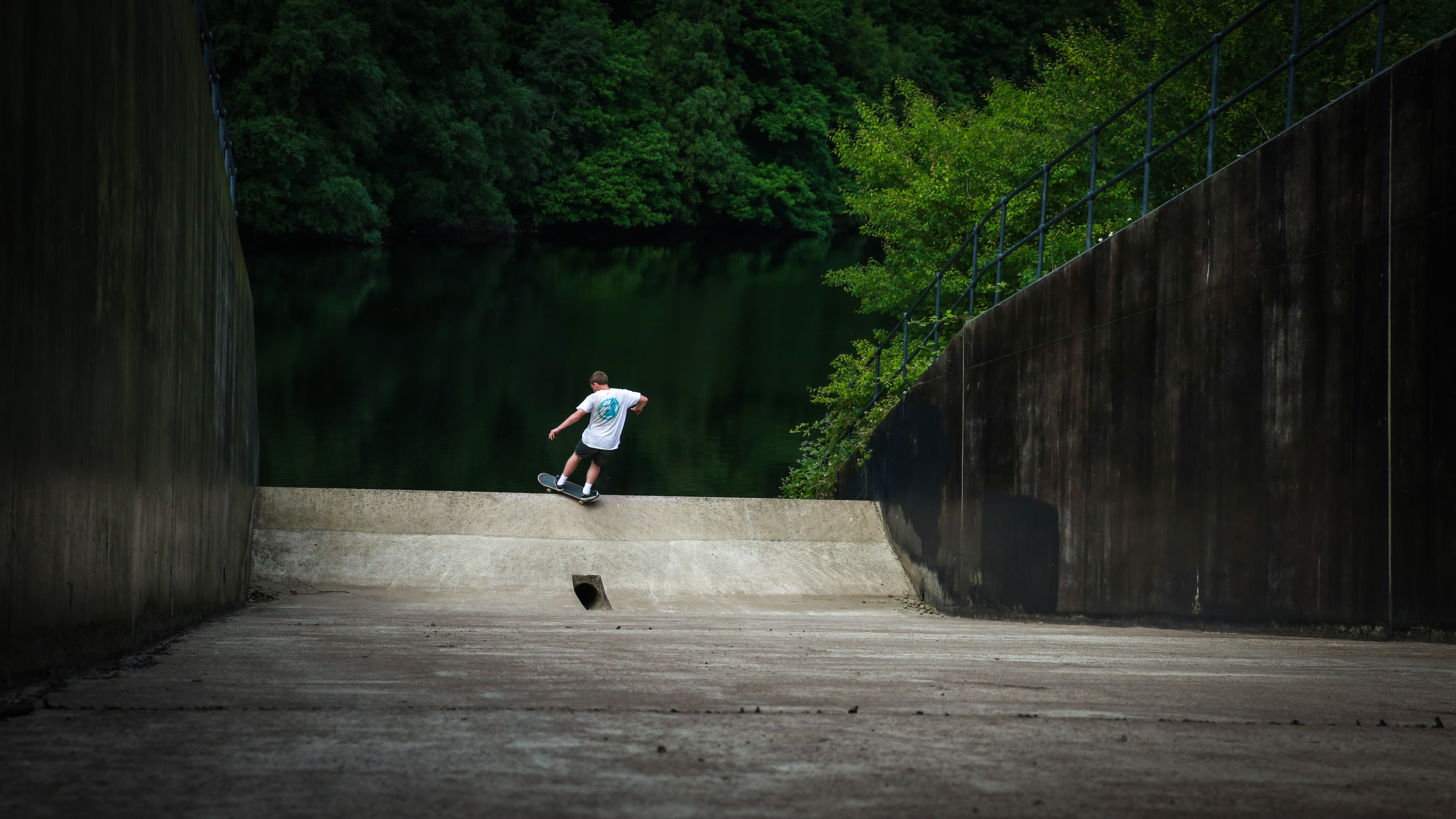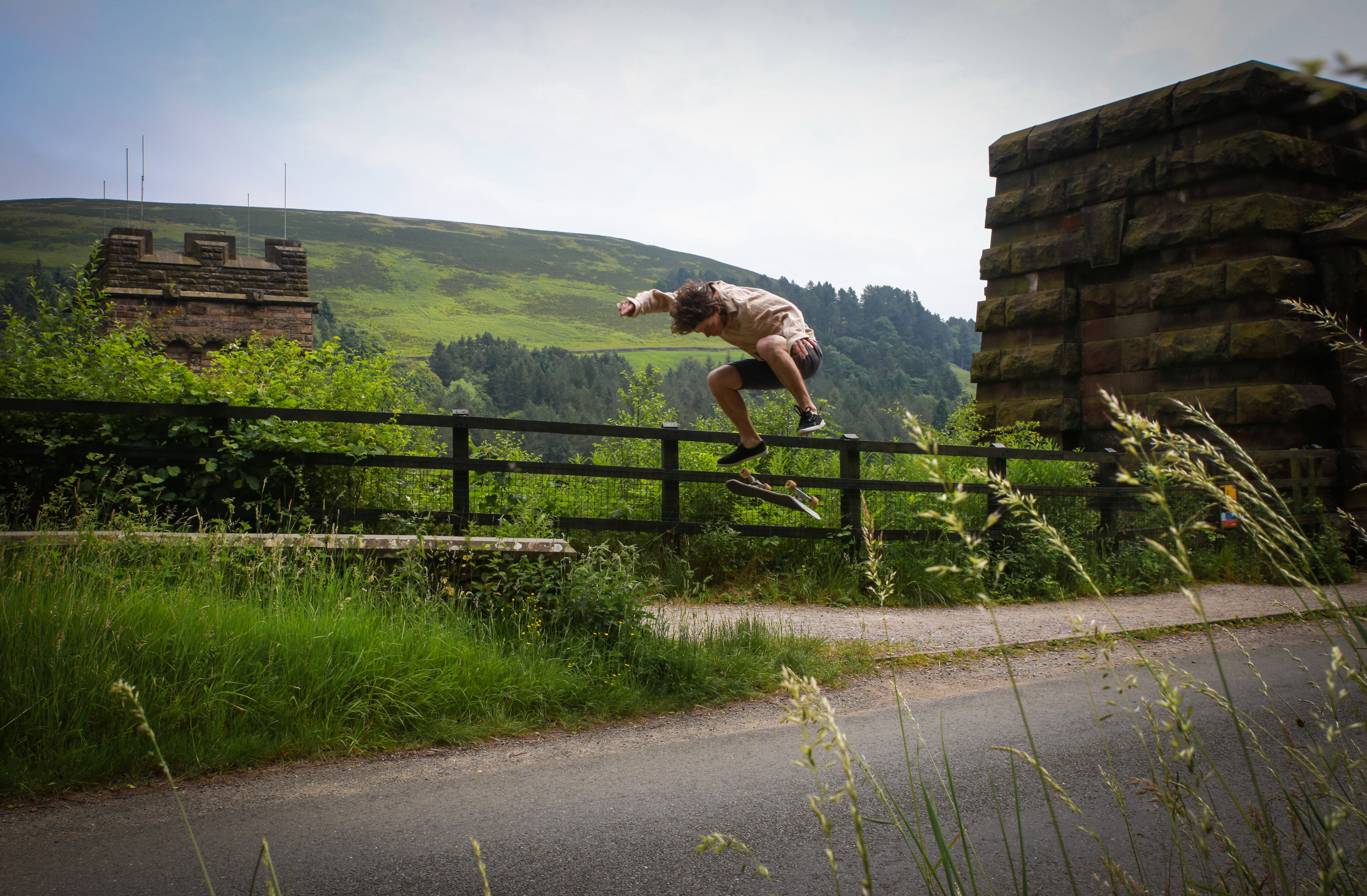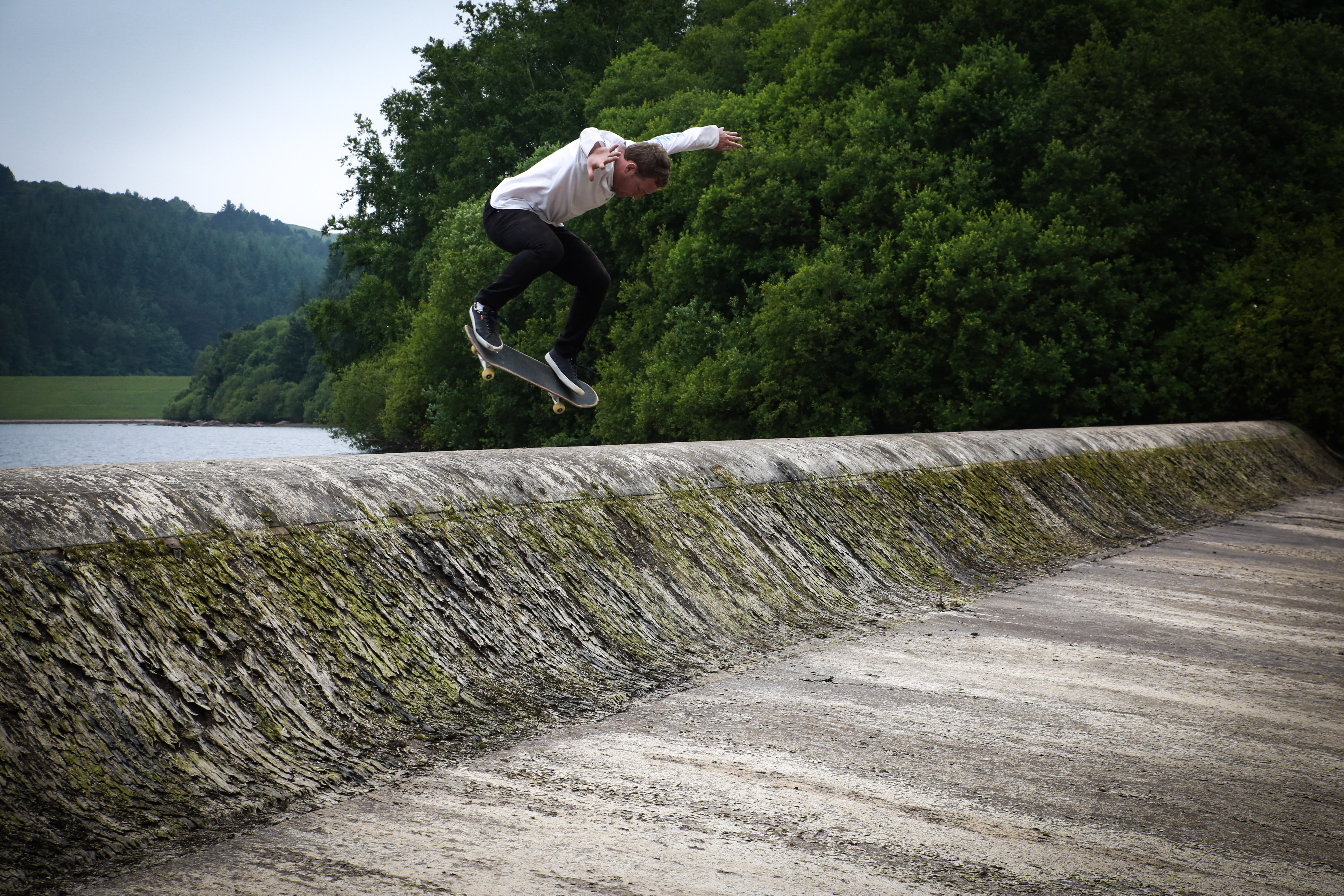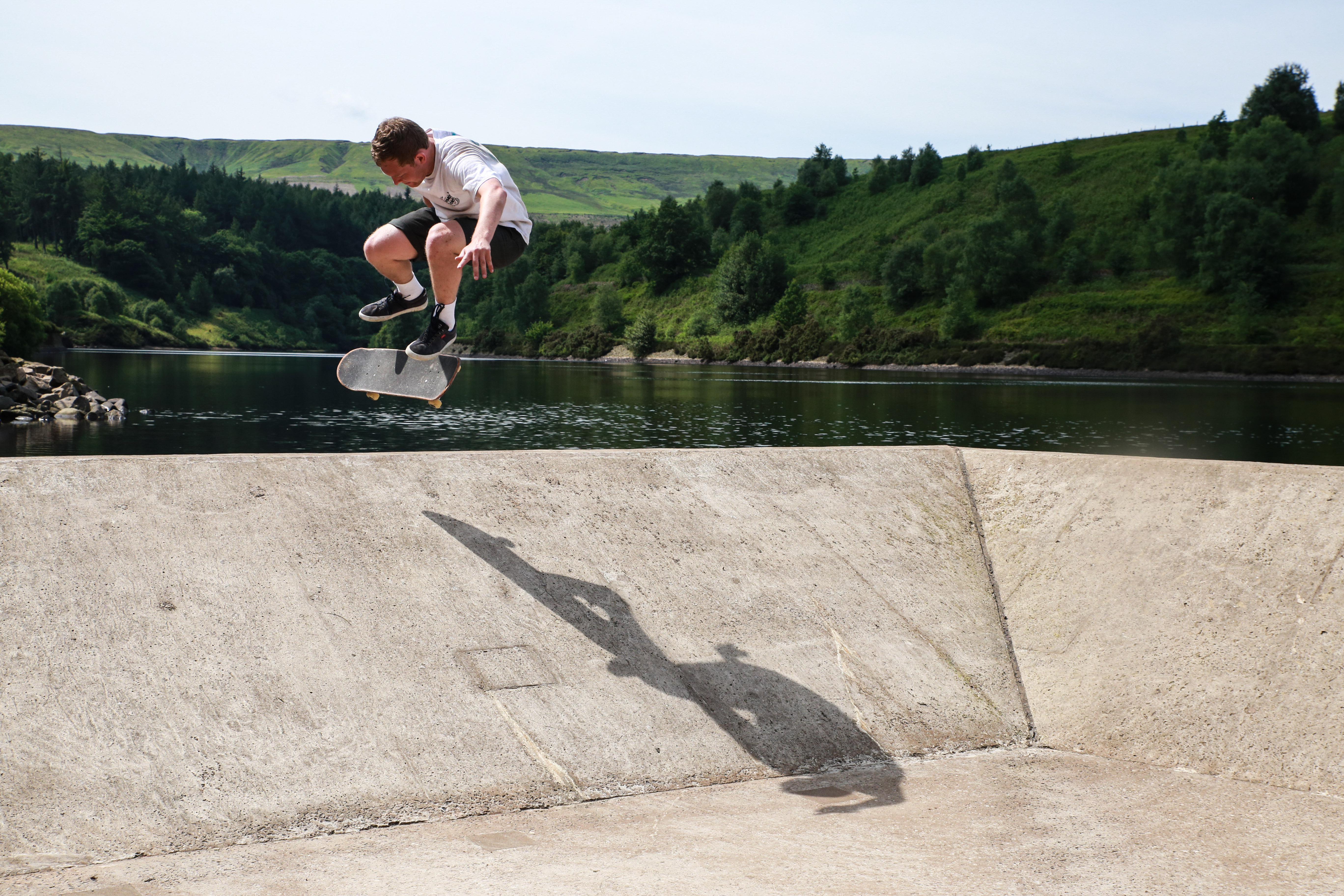 Ash was keen as a beaver to skate this reservoir spot…or just keen to escape the mosquito-ridden campsite. He was up and knocking out tricks in the fresh surroundings of the Peak District before the rest the team had surfaced. RIP Isaac’s cruiser that is now sleeping with the fishies…