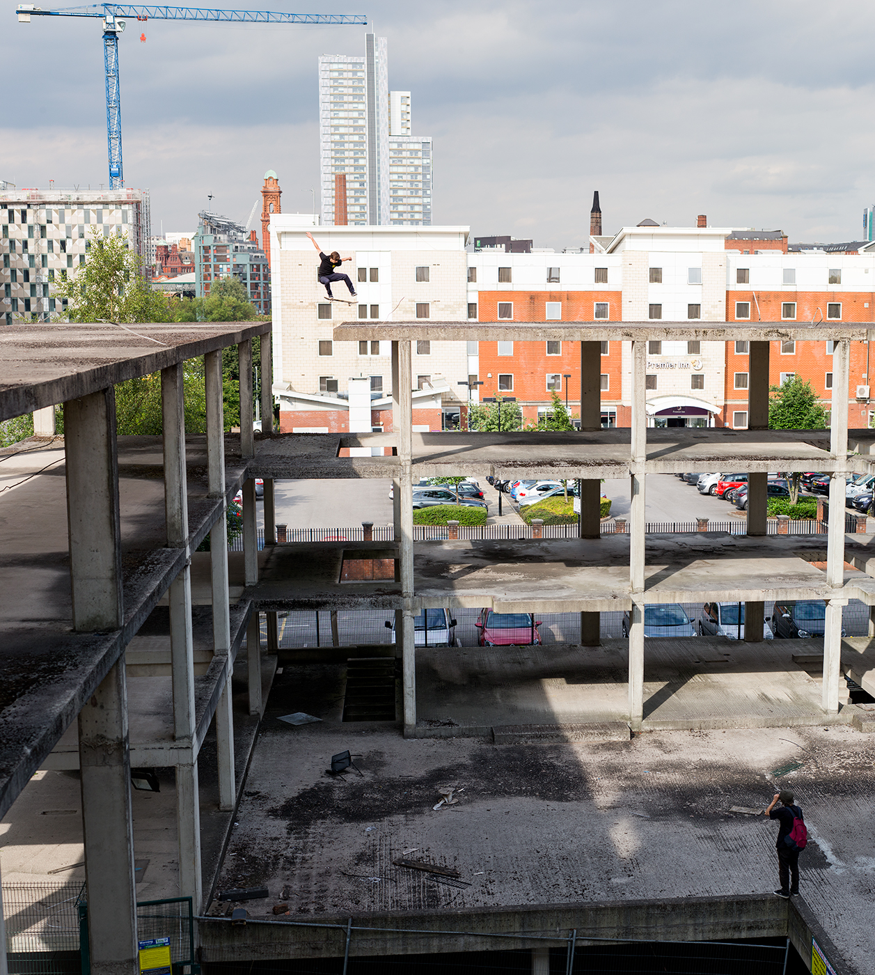 After this we had an hour to kill until Ben had work, luckily we remembered this roof spot, which we wanted to have a look at. So me, Ben and Foz set off and went to check it out. The spot was a car park with some sort of abandoned structure above it, which looked unfinished. There were a variety of roof gaps all over it. Ben wanted to check the gap that was at the very top and see if it looked skateable. We all got up there. Me and Foz were feeling sketched out but Ben wasn’t phased and had a look. He thought it would be a good idea to ollie it for a photo, me and Foz thought he was insane because the run-up was pretty short and the floor on top of the roof was covered with stones.