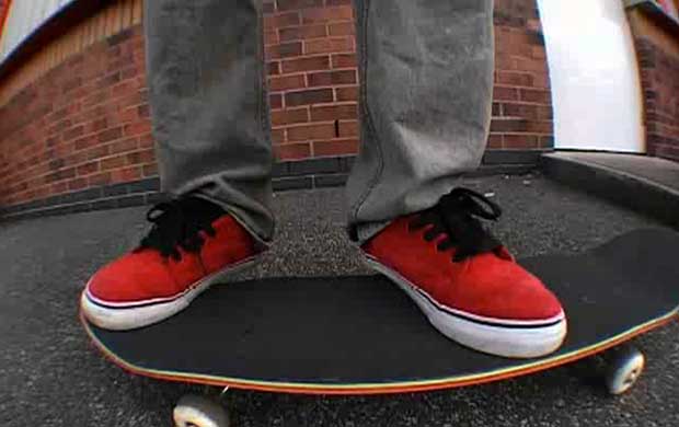 For a Shove-It, you want to get your feet into the same position as you would do the nollie, but it’s more on your back foot to pop it and scoop it.
