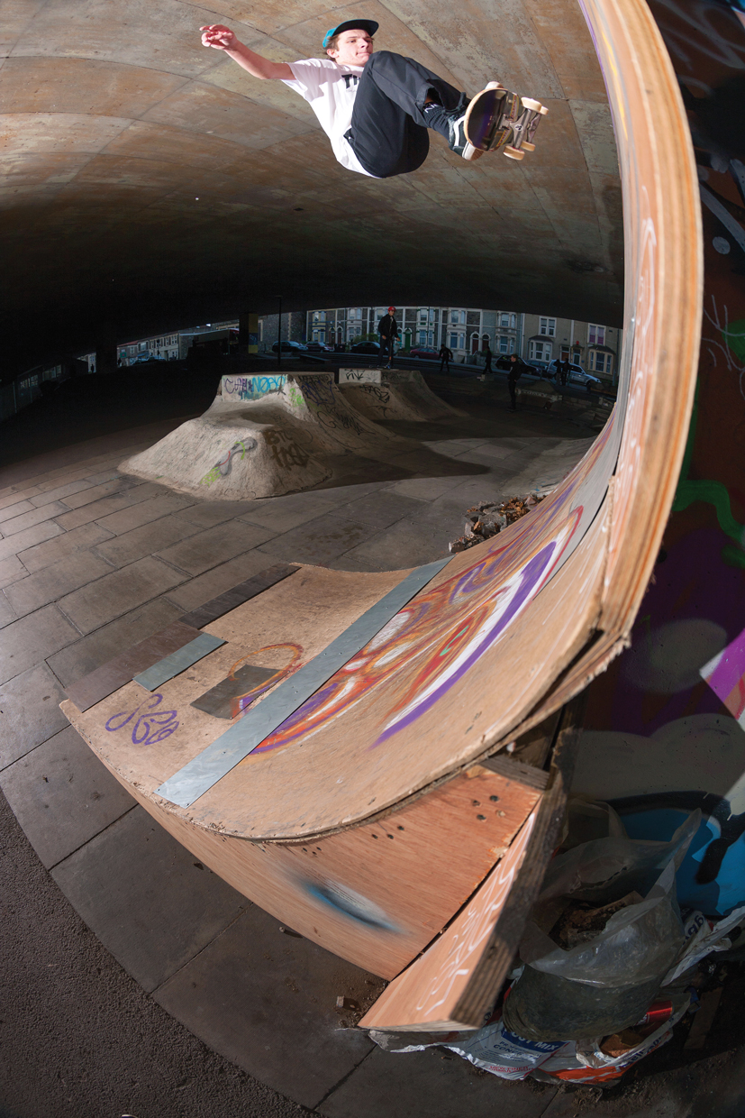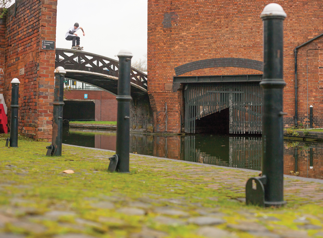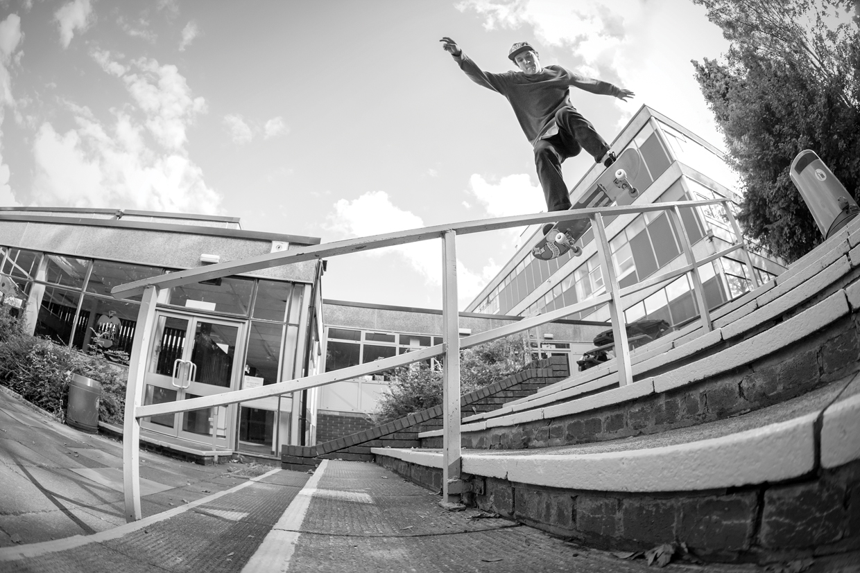 CJ: So favouring transitions over street for the most part and with the pressure on, how has fellow Stourport local and kinked-rail enthusiast Luke Kindon helped mentor you at some of the street spots in this interview?