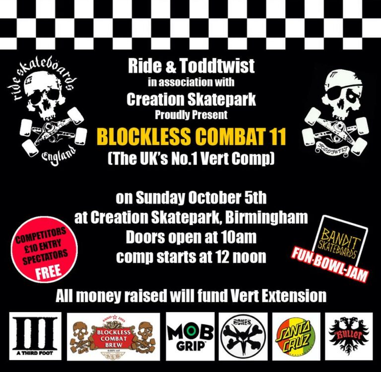 Want to skate in or witness some vert ramp carnage? Well the eleventh blockless combat event is going down this Sunday at Creation skatepark in...