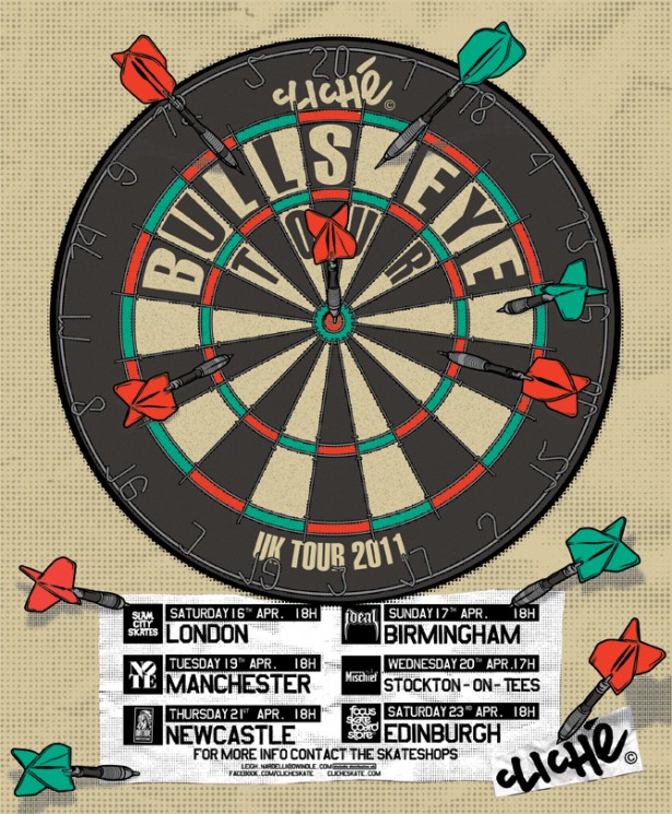 The Cliché team arrived in London last night ahead of their UK “Bullseye Tour” which kicks off properly today. We got the following through from Dwindle...