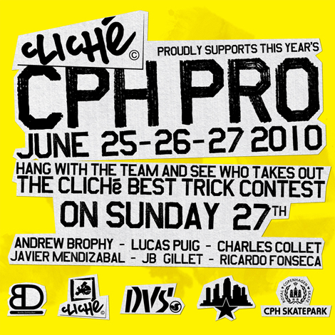 Cliche have announced support of this years CPH Pro comp, which will be taking place over 25-27th June at the Copenhagen Skatepark! Oui oui!