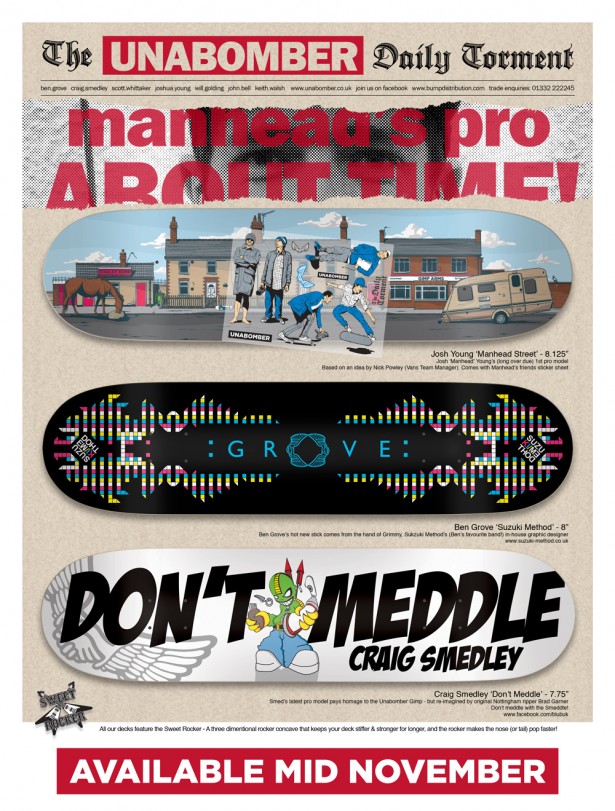 To celebrate the release of Josh “Manhead” Young’s debut pro board, Ben Grove’s Suzuki Method collaboration deck and Craig Smedley’s “Don’t Meddle” deck, Unabomber are...