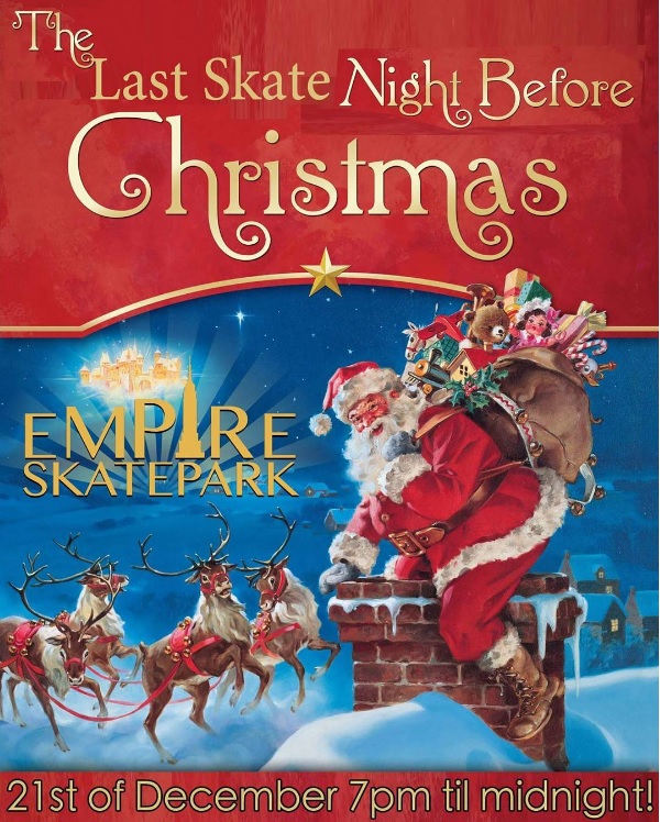 Empire Skatepark's last skate night before Christmas will take place tomorrow (21/12/16), with the park offering an extended session from 7pm to midnight. The night...