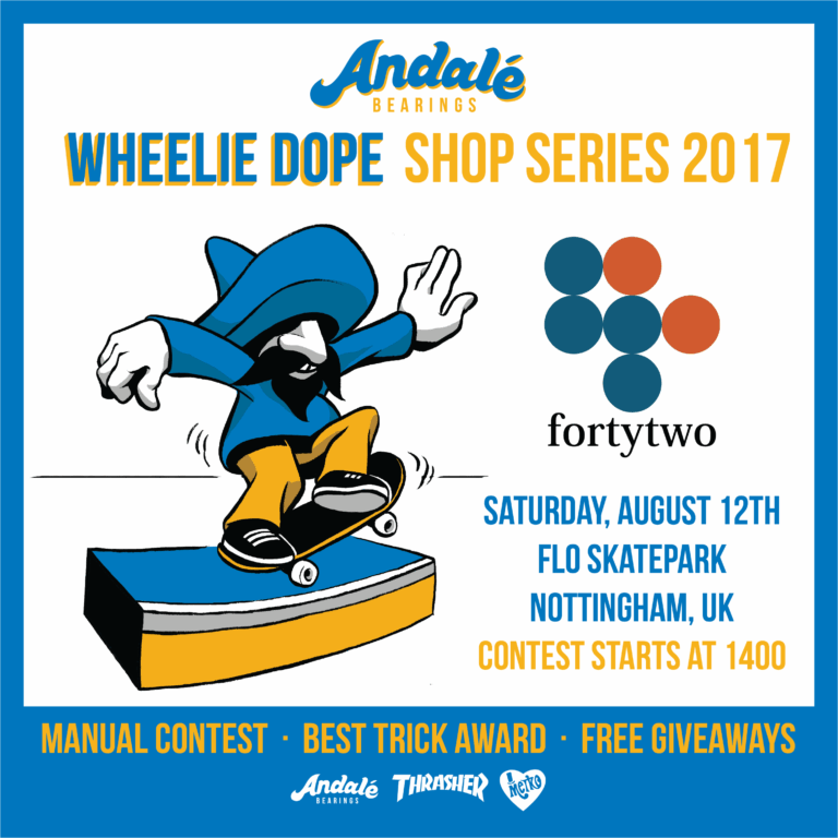 The Andale Bearings 'Wheelie Dope' Shop Series 2017 will be taking place at Flo Skatepark on August the 12th in association with Forty Two Skateshop.