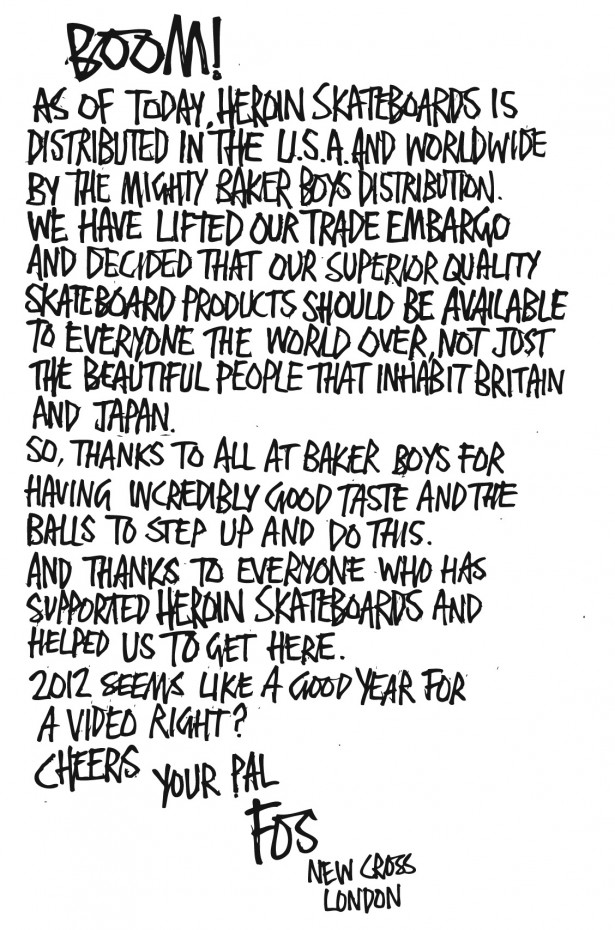 At last, Fos’ Heroin Skateboards empire heads over the Atlantic and can now be found gracing the walls of American skateshops thanks to Baker Boys...