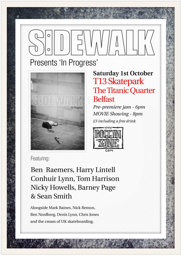 The Sidewalk “In Progress” video premiere takes place at T13 Skatepark in Belfast one week tomorrow, on Saturday October 1st, and the finalised, updated details...