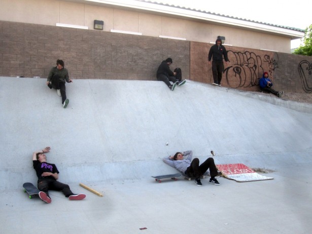 Justin Eldridge, Daniel Castillo, Kenny Anderson, Yaje Popson, Raven Tershy, Danny Montoya, David Loy, and Vincent Alvarez kill several hours during a rainy day down...