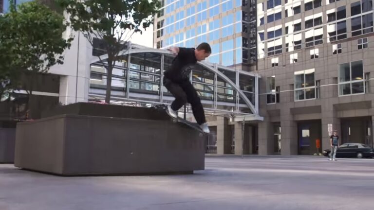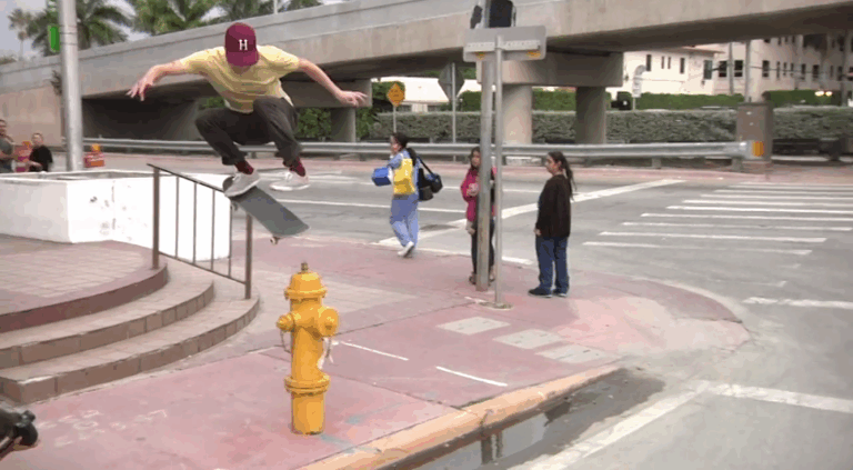 ...handling every street spot in his path with ease whether that spot is a waist high hubba, an awkward Catalan bank or a flashing disco...