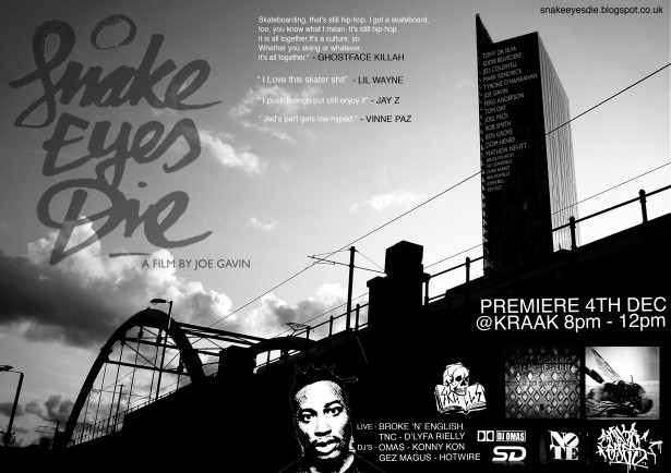 http://vimeo.com/54119563 SNAKEEYESDIE – PREMIERE HYPE from Snake Eyes Films. on Vimeo. Snake Eyes Die, Joe Gavin’s raw street representation of Manchester skateboarding, is nearly upon us! With all...