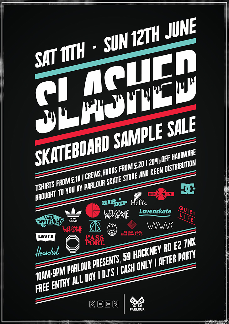 Parlour Skate Store and Keen Distribution have teamed up for 'Slashed', a skateboard sample sale which will take place over this coming weekend at Parlour...