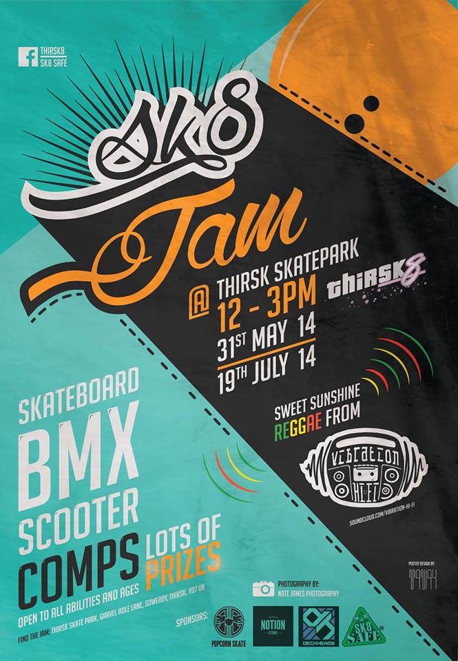 First of many Skate Jams this summer to be announced by Sk8 Safe. 31st May 2014 12-3pm Thirsk Skate Park, Thirsk, North Yorkshire Skateboard, BMX and Scooter Comp Open to...