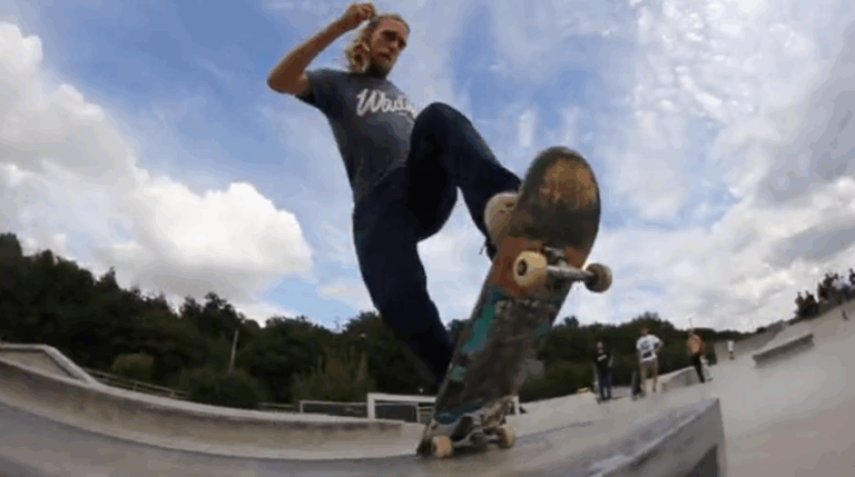 Scott Whittaker celebrates 30 rotations around the sun with 30 stunts on his woodplank down at the local in some fetching trousers.