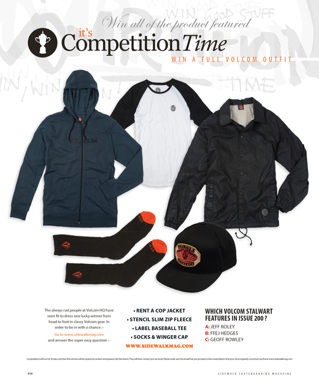 The always rad people at Volcom HQ have seen fit to dress one lucky winner from head to foot in classy Volcom gear! Including: – Rent-a-Cop...