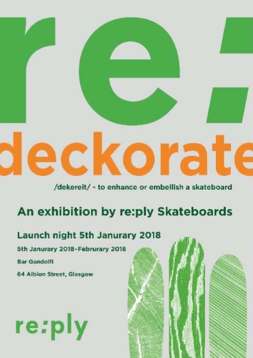 re:ply Skateboards are hosting the re:deckorate Exhibition on January the 5th, with art made from recycled boards auctioned in order to raise funds for SkatePAL.