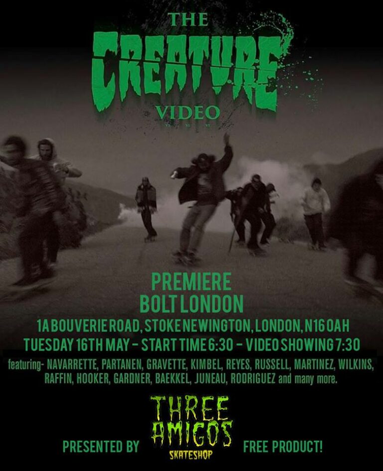Creature Skateboards latest offering, simply titled 'The Creature Video' will be premiered by North London's Three Amigos Skateshop at Bolt London in Stoke Newington tomorrow...