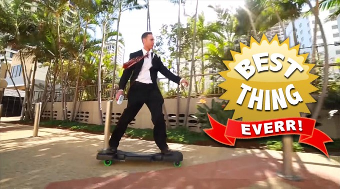 Their first excursion into the world of wacky ideas and blue-sky thinking deals with the ‘case board’ which, wait for it, is a briefcase that turns into a motorised skateboard allowing the user to look like some kind of overgrown Scalextric enthusiast pumping past the local offy on what looks more like a guitar case than a skateboard.