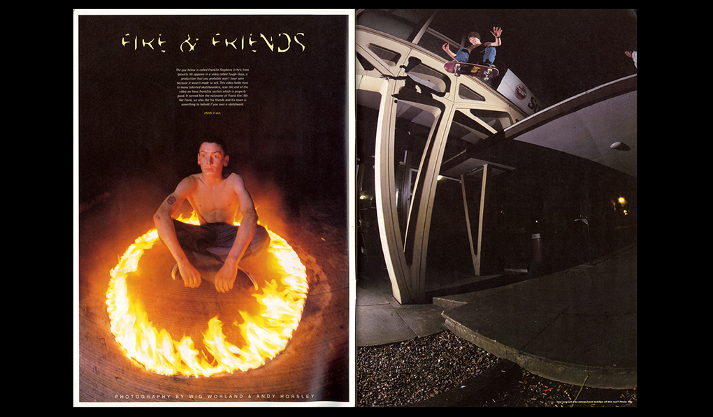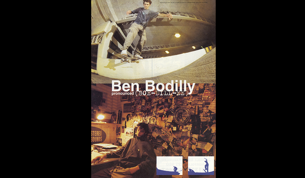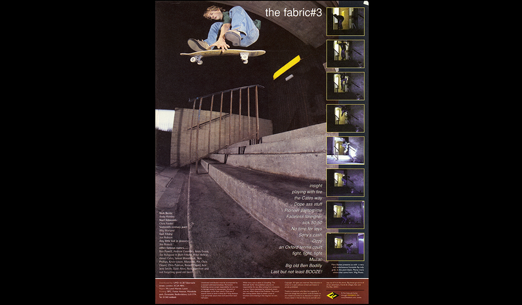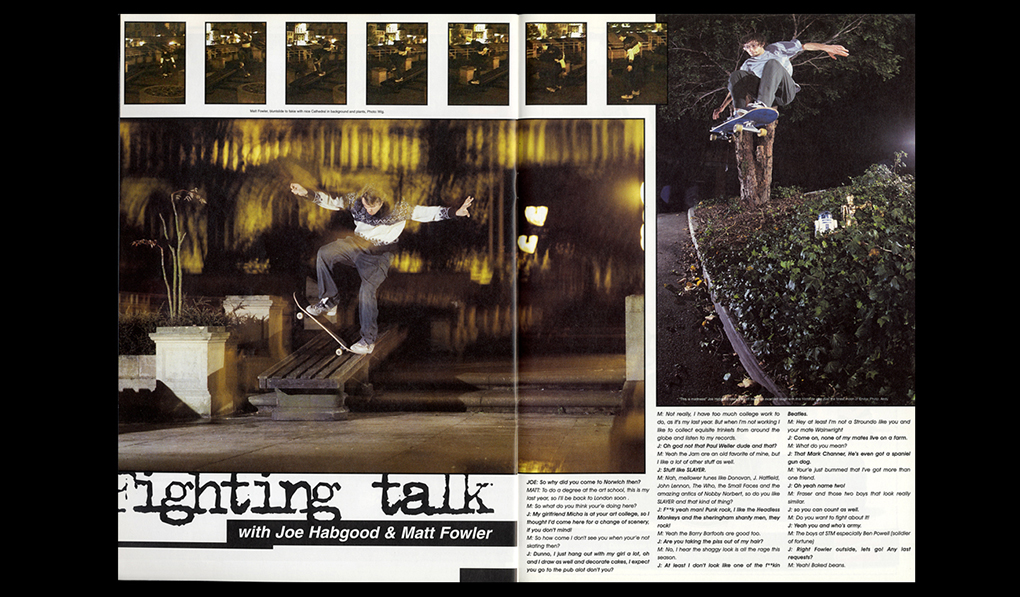 People would flock to Broadmarsh banks in Nottingham to skate their mythical bricks curves throughout the 80’s and 90’s. Harry managed to get a skinful of training in whilst we lived there so this massive ollie grab was a ‘piece of peas’. Check the monster set-up and Simple shoes.