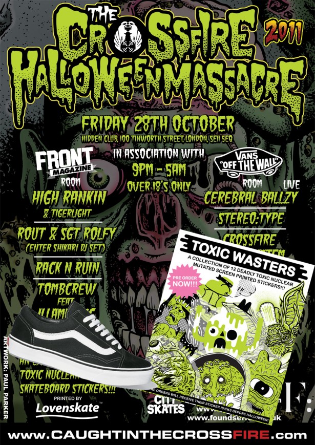 Anyway, we’ve teamed up with Crossfire to bring you the chance to not only get your mitts on one of these super limited “Toxic Wasters” packs, but also get you a pair of tickets to the Halloween Massacre, and a pair of Vans “Old Skools” shoes as well. All you need to do to earn yourself this rad prize bundle is head on over to the Sidewalk Forum Crossfire Comp thread and post up your best photo of how you have made use of your own stickers over the years – be it on walls, boards, fridges, dogs, cabinets, doors…anything, really. The most creative/visually impressive use of stickers wins! Simple.
