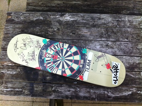 In addition to that, the fellows at Dwindle are also going to throw in a signed “Bullseye” team board, scrawled on by the likes of Lucas Puig, Charles Collet, Flo Mirtain, Sammy Winter, Joey Brezinski and Javier Mendizabal.